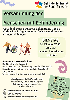 Die Versammlung kann über das Internet mitverfolgt werden. Fragen und Anregungen können dann im Chat formuliert werden. Für die Teilnahme an dieser Form wird gebeten, sich per E-Mail unter behindertenbeirat@eichstaett.de oder telefonisch unter 084218939759 anzumelden. Die Zugangsdaten werden dann übermittelt.